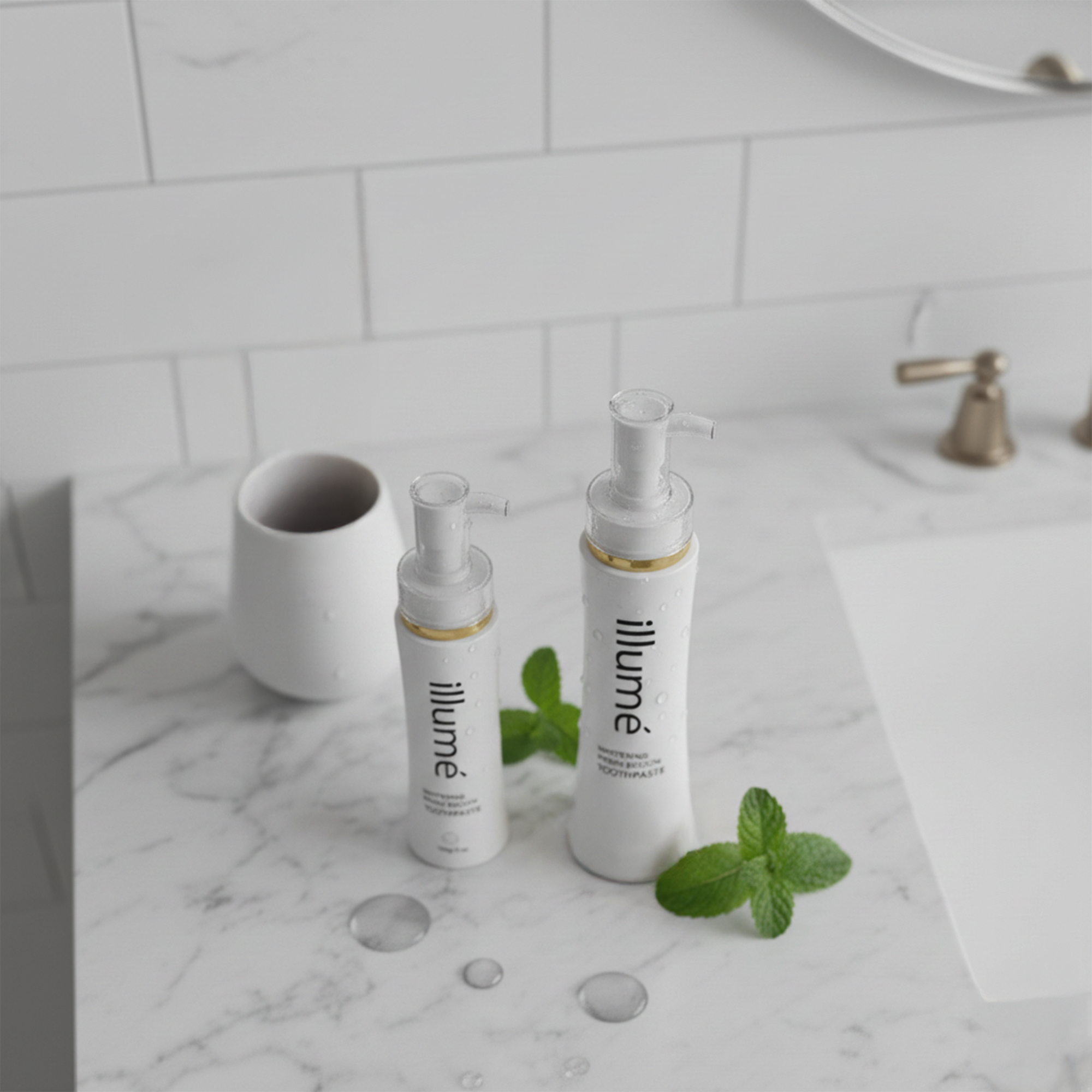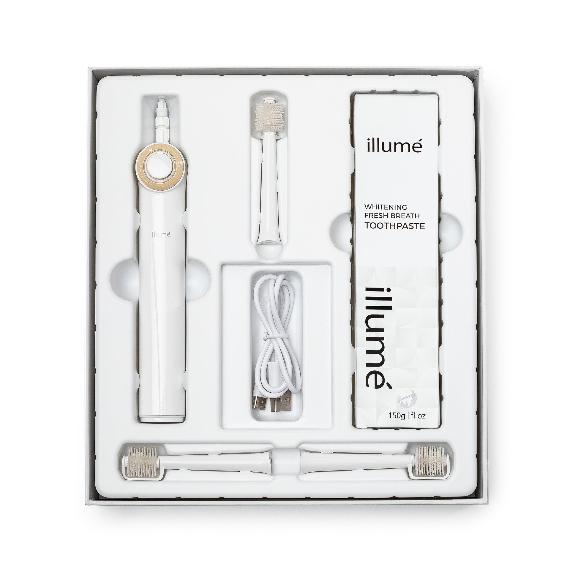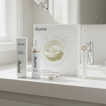 The illumé toothbrush uses a rotating dual-direction brush head designed to clean all sides of every tooth at once. Unlike standard vibrating brushes, its circular motion reaches around the gumline and between teeth, removing buildup in places traditional brushing can’t reach. The result is a noticeably cleaner, smoother feel after every use.